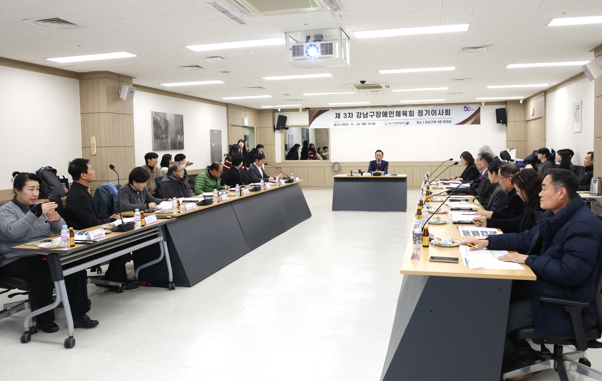 ▶ 내용 : 2025년 12월 23일 강남구장애인체육회는 제3차 정기이사회를 개최하였습니다. 이사 총원 14명 중 13명이 참석하였으며, 2025년도 사업 결과 및 결산, 2026년도 사업계획(안), 직원승진(안) 건으로 진행되었습니다.