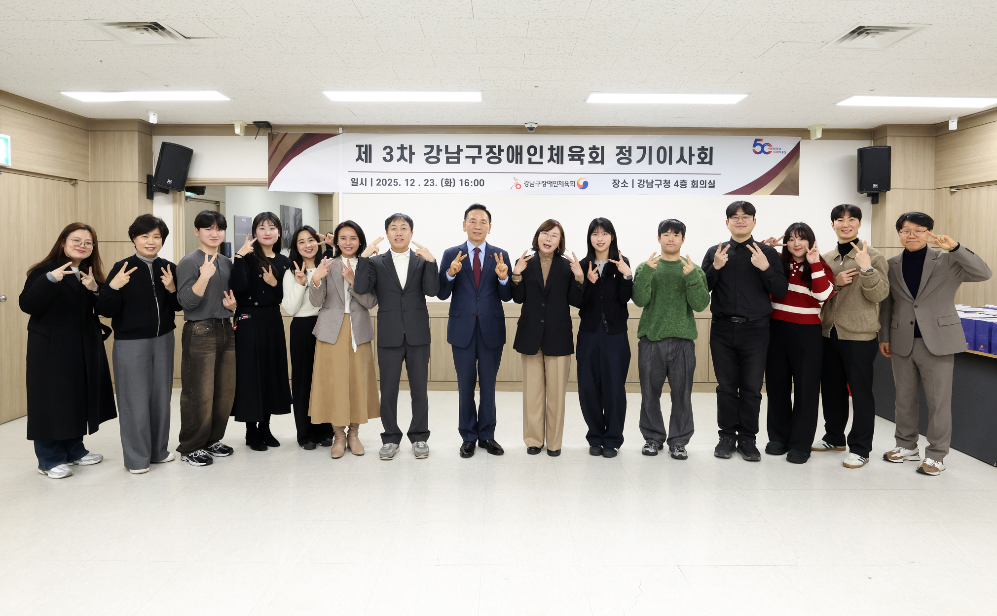 ▶ 내용 : 2025년 12월 23일 강남구장애인체육회는 제3차 정기이사회를 개최하였습니다. 이사 총원 14명 중 13명이 참석하였으며, 2025년도 사업 결과 및 결산, 2026년도 사업계획(안), 직원승진(안) 건으로 진행되었습니다.